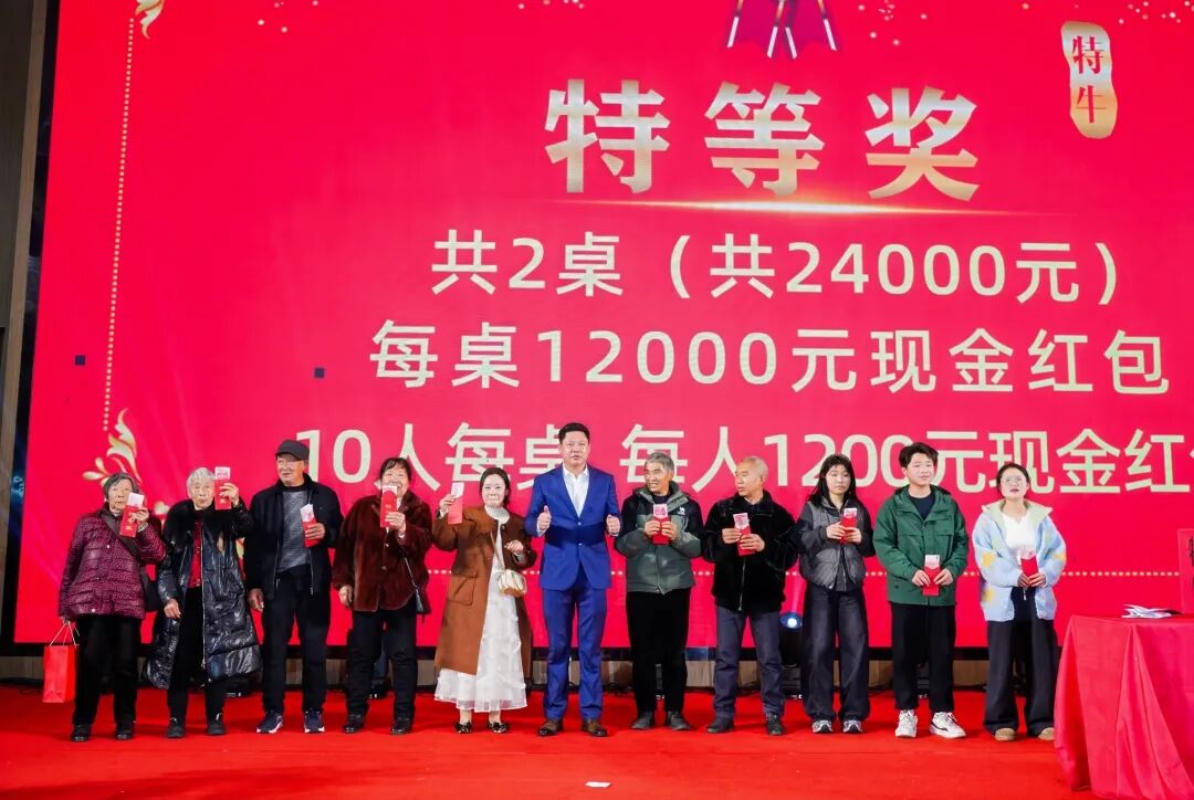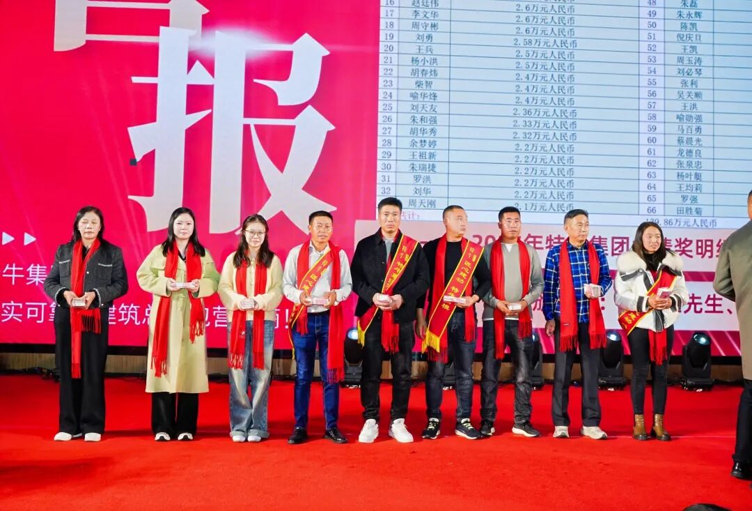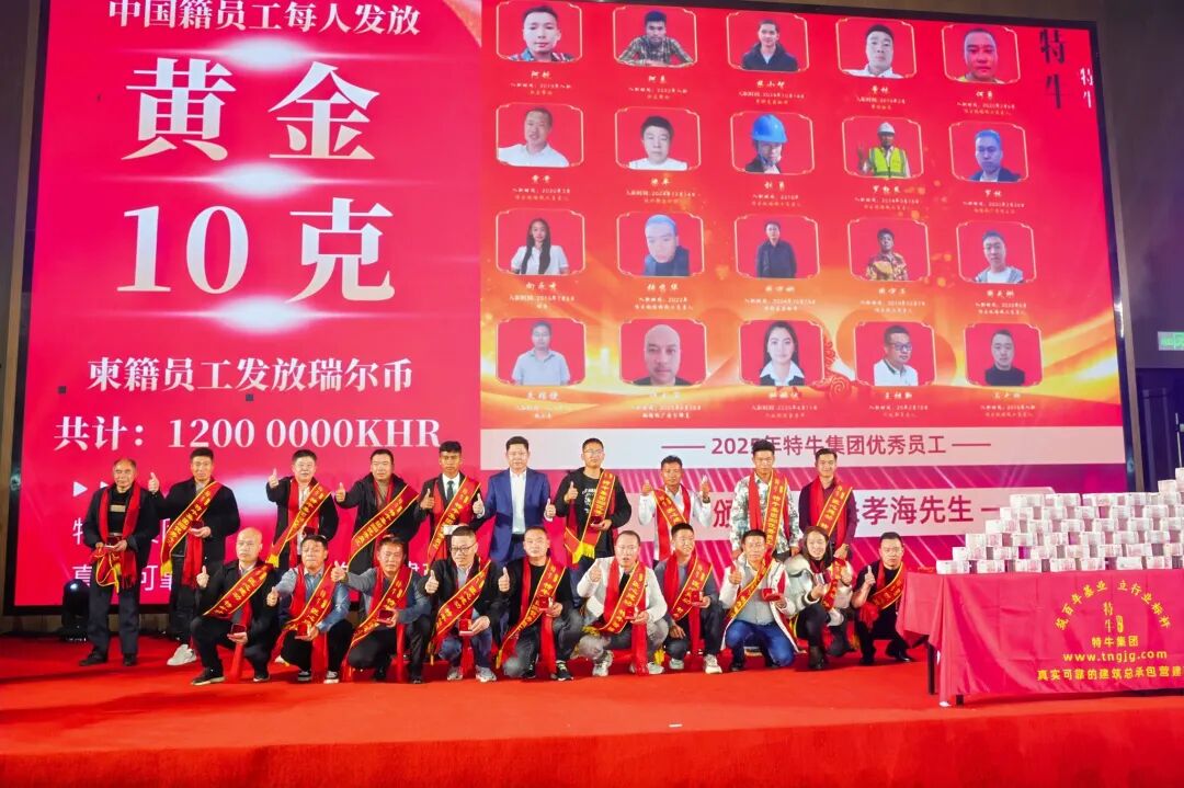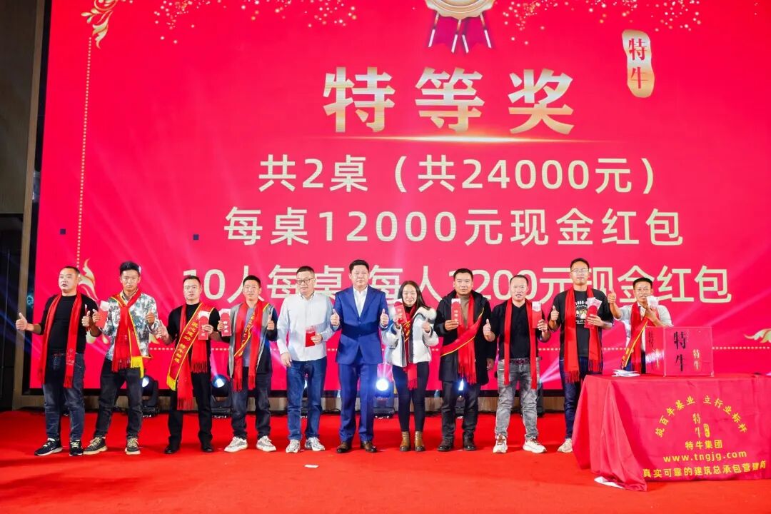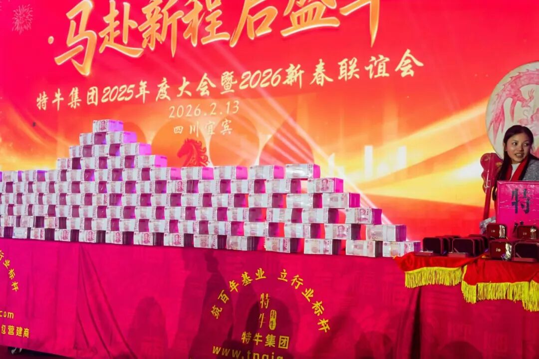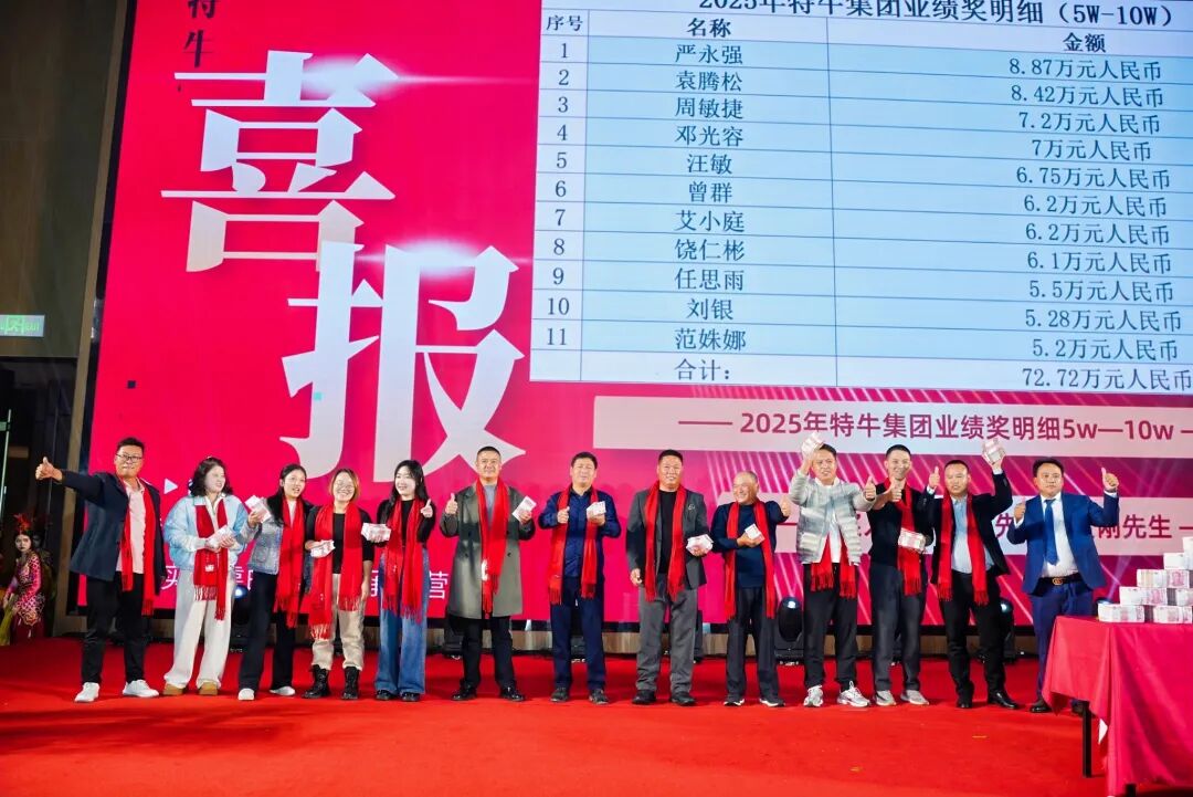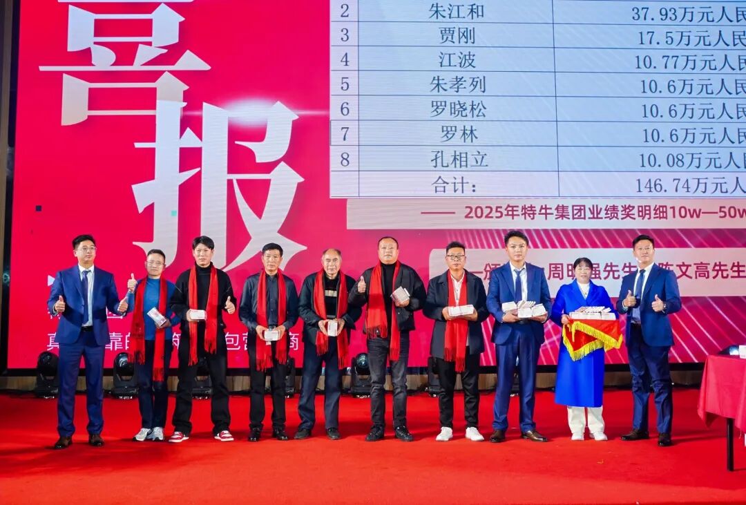 特牛今日的辉煌,离不开海内外同仁并肩作战,更离不开家属默默支撑。为践行“共享发展红利”承诺,集团今年拿出2100多万元重奖全体员工及家属,集中转账969.70848万元、现场发放现金1125万元、260克黄金福利及各类暖心福利,切实增强全体员工及家属的获得感与幸福感。这并非一时之举,而是特牛多年秉持的原则——将企业利润更多惠及团队,坚守“持续增加员工收入”核心宗旨。从边疆工地到海外项目组,从技术研发岗到后勤保障线,每一份付出皆被看见,每一份坚守皆被珍视。这份沉甸甸的回馈,既是对过往辛劳的嘉奖,更是对未来同行的期许。